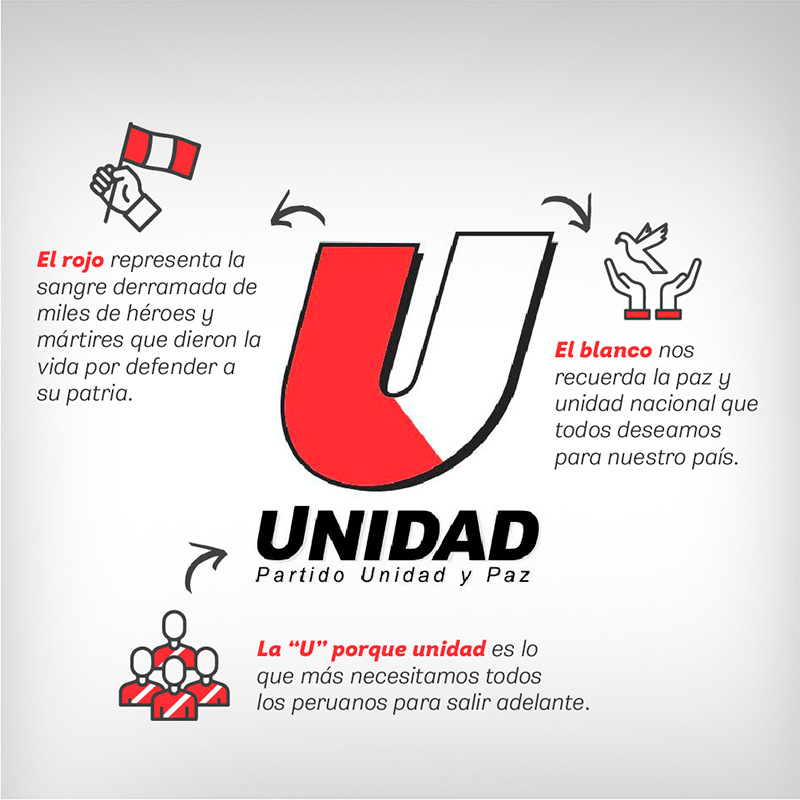 El símbolo del PARTIDO UNIDAD Y PAZ está conformado por la letra U con los colores patrios rojo y blanco, símbolos inequívocos del patriotismo de sus integrantes y del lema – mensaje Unidad y Paz columnas vertebrales que llevarán al país desarrollo con la paz y en seguridad.